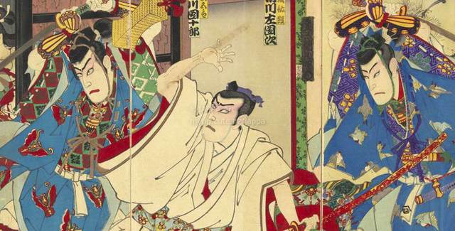 > 豊原国周 - 曽我復讐場:曽我十郎 尾上菊五郎 工藤祐経 市川左団次:曽我五郎 市川団十郎 大磯虎 坂東志う調