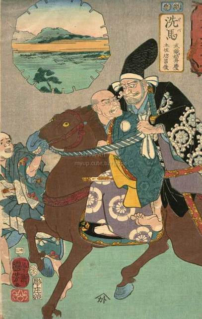 > 歌川国芳 - 木曾街道六十九次之内:三十二:洗馬 武藏坊弁慶 土佐坊昌俊