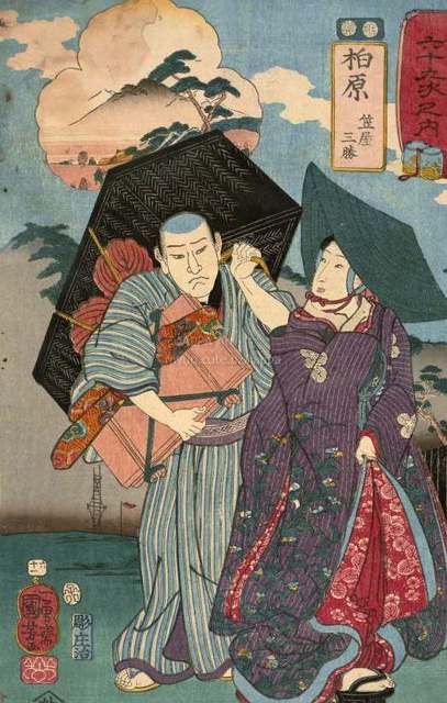 > 歌川国芳 - 木曾街道六十九次之内:柏原:笠屋三勝 六十一