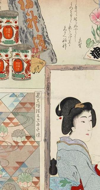 梅素薫 - 東京じまん名物会:古今亭今輔: ヒラ辰:酒悦本店 福神漬:下谷すき屋町 竹松葉屋つる松 大高すゞ:見立模様不忍弁天染