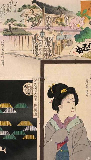 梅素薫 - 東京じまん名物会:柳家つばめ:ビラ辰:菅俣吉兵衛 薬屋 すゞめの千足焼:赤さか 春本内小若 藤本あか:見立模様上野黒門袴腰染