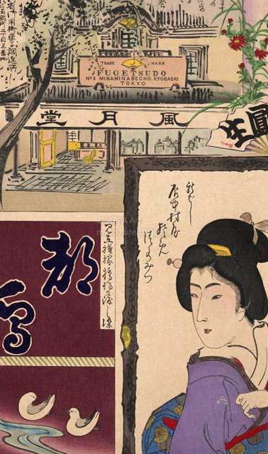 梅素薫 - 東京自慢名ぶつ会:三遊亭圓生:ビラ辰:宮内省御用御菓子調進所 風月堂:新ばし辰中村屋そめ 清水みつ:見立模様橋場の渡し染め