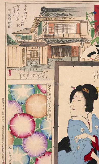 梅素薫 - 東京自慢名ぶつ会:帰天斎正一:会席御料理 いよもん 町田紋次郎:下谷すき谷町 八重 佐橋志よう:見立模様入谷蕣絞り