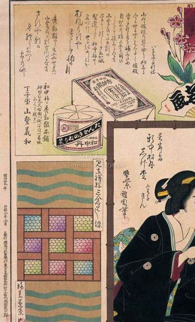 主页 > 豊原国周 | 梅素薫 > 豊原国周, 梅素薫 - 東京自慢名物会:つるが若辰:ビラ辰:和中丹 秀効散本舗丁字堂 山登義和:霊岸島新中村屋 しげ松 金子きん:見立模様三倉はし染