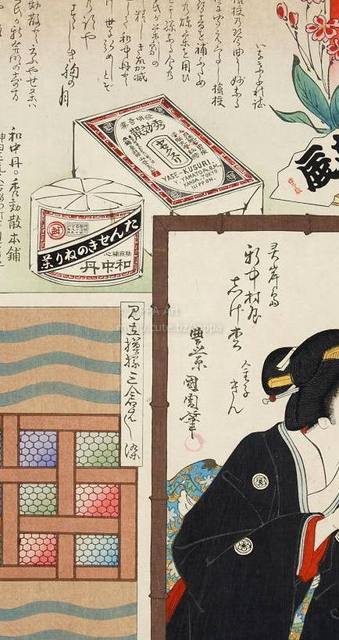 主页 > 豊原国周 | 梅素薫 > 豊原国周, 梅素薫 - 東京自慢名物会:つるが若辰:ビラ辰:和中丹 秀効散本舗丁字堂 山登義和:霊岸島新中村屋 しげ松 金子きん:見立模様三倉はし染
