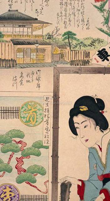 > 梅素薫 - 東京自慢名物会:一立斎文車:ビラ辰:御貸席 名倉まつ:柳ばし 平岡屋きた 本名黒川きた:見立模様首尾の松染