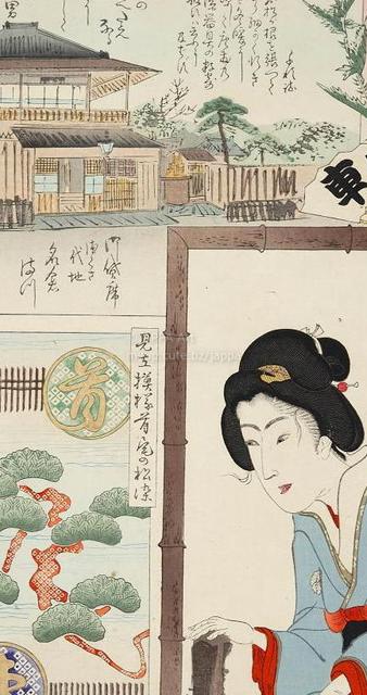 > 梅素薫 - 東京自慢名物会:一立斎文車:ビラ辰:御貸席 名倉まつ:柳ばし 平岡屋きた 本名黒川きた:見立模様首尾の松染