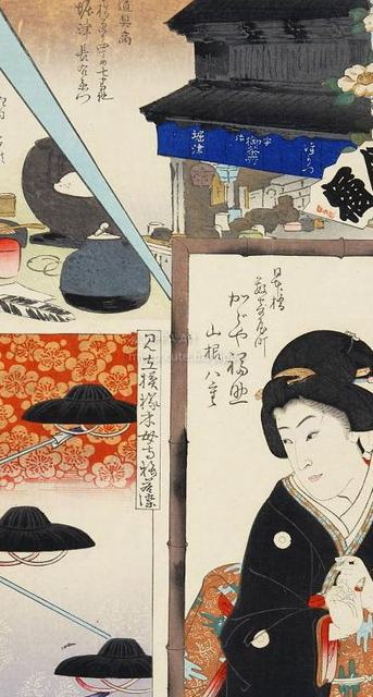 > 豊原国周, 梅素薫 - 東京自慢名物会:三遊亭円橘:ビラ辰:茶道具商 堀津長右衛門:日本橋数寄屋町 かがや福助 山根八重:見立模様木母寺梅若染