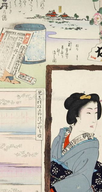 > 梅素薫 - 東京自慢名物会:三遊亭圓右:ビラ辰:寶丹 守田治兵衛:下谷すきや町 松葉屋いね 鈴木いね:見立模様上野清水秋色染