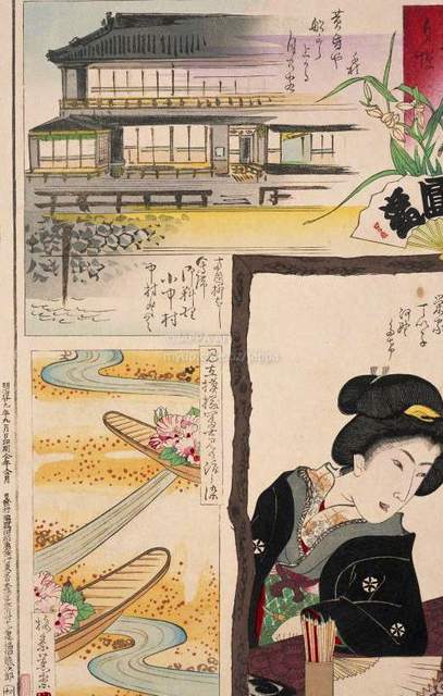 梅素薫 - 東京自慢名物会:三遊亭圓遊:ビラ辰:会席料理 小中村 中村とく:柳ばし 栄家てい子 河野たけ:見立模様冨士見の渡し染