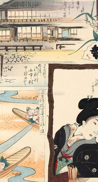 梅素薫 - 東京自慢名物会:三遊亭圓遊:ビラ辰:会席料理 小中村 中村とく:柳ばし 栄家てい子 河野たけ:見立模様冨士見の渡し染