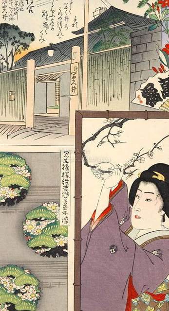 豊原国周, 梅素薫 - 東京自慢名物会:三遊亭萬橘:ビラ辰:待合 新冨久井 榎本こう:新吉原仲之町 濱の屋奈津 岸上はつ:見立模様往昔浅草並木染