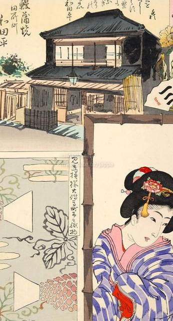 梅素薫 - 東京自慢名物会:三遊亭遊三:ビラ辰:鰻蒲焼 和田平:よし町きゝやう家よし子 佐藤よし:見立模様大傳馬町市之織物