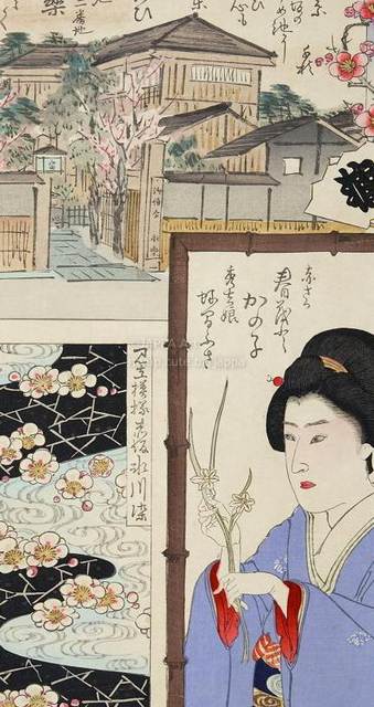 豊原国周, 梅素薫 - 東京自慢名物会:五明楼玉輔:ビラ辰:まちあひ 永楽 林とく:赤さか春もとかの子 秀吉娘 蛭間ふさ:見立模様赤坂氷川染