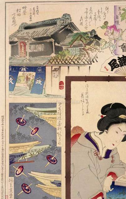 梅素薫 - 東京自慢名物会:伊東燕尾:ビラ辰:煙管 村田七右衛門:浅草新須賀町壱番地 長坂はる子:見立模様薬研堀そめ
