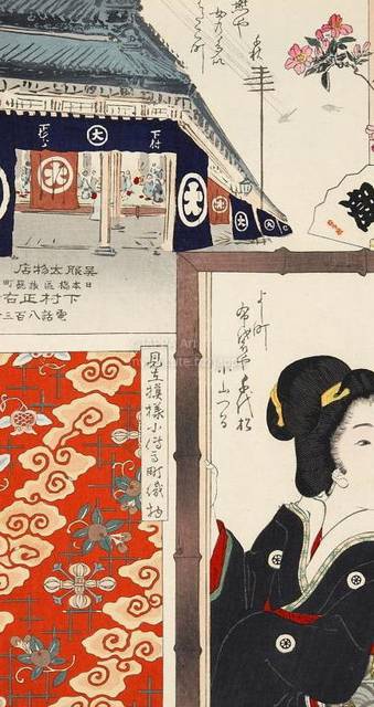 > 梅素薫 - 東京自慢名物会:伊東陵潮:ビラ辰:呉服太物店 下村正右衛門:よし町 布袋や千代松 小山つる:見立模様小傳馬町織物