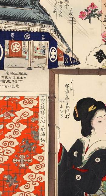 > 梅素薫 - 東京自慢名物会:伊東陵潮:ビラ辰:呉服太物店 下村正右衛門:よし町 布袋や千代松 小山つる:見立模様小傳馬町織物