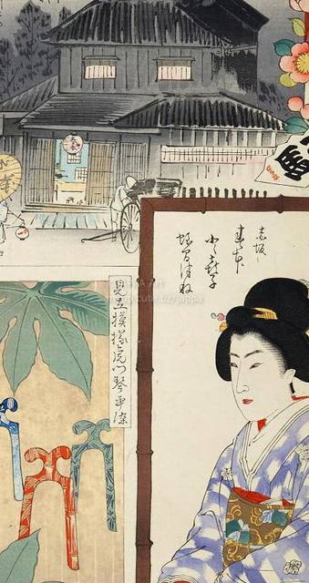 > 豊原国周, 梅素薫 - 東京自慢名物会:土橋亭里う馬:ビラ辰:春本 芸者屋 蛭間そめ:赤坂 春本と㐂子 蛭間つね:見立模様虎門琴平染