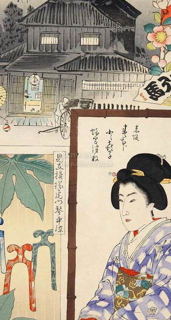 > 豊原国周, 梅素薫 - 東京自慢名物会:土橋亭里う馬:ビラ辰:春本 芸者屋 蛭間そめ:赤坂 春本と㐂子 蛭間つね:見立模様虎門琴平染