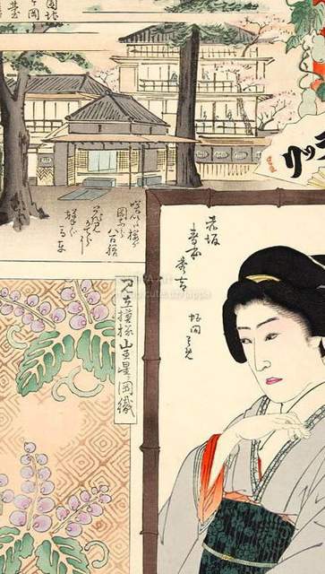 豊原国周, 梅素薫 - 東京自慢名物会:快樂亭ブラック:ビラ辰:八百膳:赤坂 春本秀吉 蛭間そめ:見立模様山王星ヶ岡織