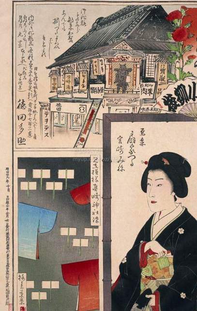 > 豊原国周, 梅素薫 - 東京自慢名物会:春風亭小柳枝:ビラ辰:化粧品切手調進 徳田多助:烏森 扇屋つる 宮崎みね:見立模様眞崎神社染