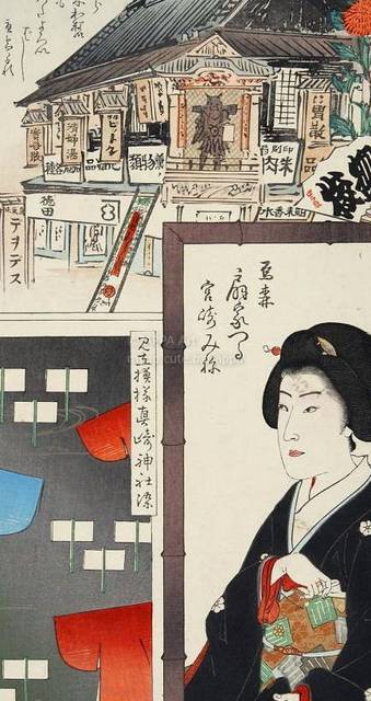豊原国周, 梅素薫 - 東京自慢名物会:春風亭小柳枝:ビラ辰:化粧品切手調進 徳田多助:烏森 扇屋つる 宮崎みね:見立模様眞崎神社染