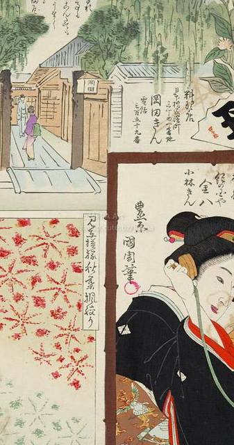 > 豊原国周, 梅素薫 - 東京自慢名物会:柴田南玉:ビラ辰:料理店 岡田きん:柳橋紀の国や金八 小林きん:見立模様秋葉楓絞り
