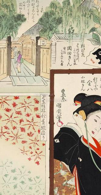 > 豊原国周, 梅素薫 - 東京自慢名物会:柴田南玉:ビラ辰:料理店 岡田きん:柳橋紀の国や金八 小林きん:見立模様秋葉楓絞り