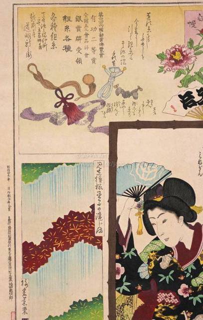 梅素薫 - 東京自慢名物会:桂文治:ビラ辰:越前屋道明新兵衛 組糸:下谷すきや町 梅本小竹 三好ぎん:見立模様王子の滝じま