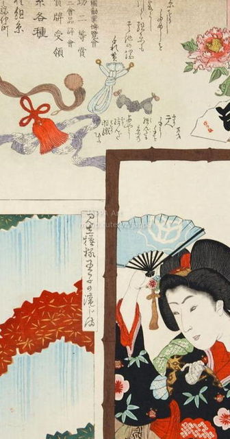 梅素薫 - 東京自慢名物会:桂文治:ビラ辰:越前屋道明新兵衛 組糸:下谷すきや町 梅本小竹 三好ぎん:見立模様王子の滝じま
