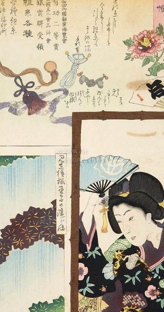 > 梅素薫 - 東京自慢名物会:桂文治:ビラ辰:越前屋道明新兵衛 組糸:下谷すきや町 梅本小竹 三好ぎん:見立模様王子の滝じま