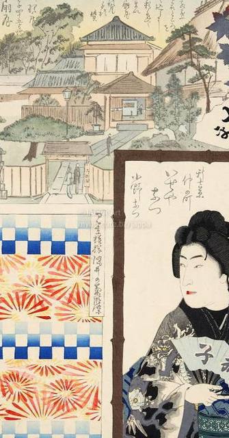 豊原国周, 梅素薫 - 東京自慢名物会:桜川七平:扇屋 御料理:新吉原仲の町 いせやなつ 小野なつ:見立模様染井の菊段染
