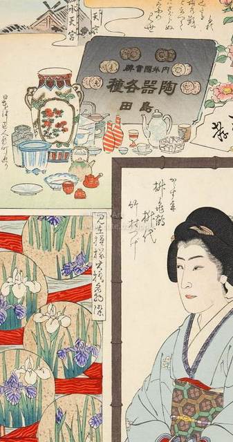 豊原国周, 梅素薫 - 東京自慢名物会:桜川三孝:陶器問屋 三宗商店:からす森 桝亀鶴 桝代 竹村つげ:見立模様大橋名物染