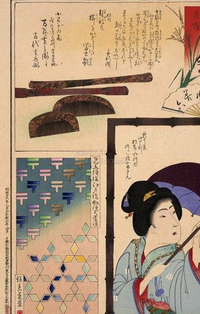 > 梅素薫 - 東京自慢名物会:桜川善六:小間もの商 万屋吉兵衛事万代吉兵衛:新よし原仲之町 松本やっこ 延しん娘小林きん:見立模様江戸橋郵便三ツ菱染