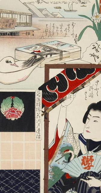 > 豊原国周, 梅素薫 - 東京自慢名物会:桜川新孝:はまきん しそ巻 焼唐からし:新よし原 さがみやさと 野崎さと:見立模様花川戸達染