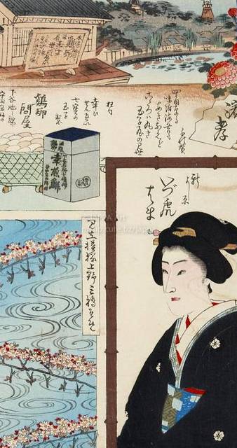 豊原国周, 梅素薫 - 東京自慢名物会:桜川濱孝:鶏卵問屋 今井六兵衛:新よし原 いづ虎 はま:見立模様上野三橋そめ