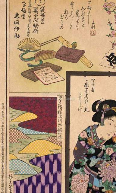 豊原国周, 梅素薫 - 東京自慢名物会:神田伯治:ヒラ辰:宝梅堂 太田伊助 袋物、小間物:からす森 扇屋しげ丸 三宅しげ:見立模様品川御殿山染