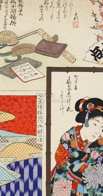 豊原国周, 梅素薫 - 東京自慢名物会:神田伯治:ヒラ辰:宝梅堂 太田伊助 袋物、小間物:からす森 扇屋しげ丸 三宅しげ:見立模様品川御殿山染