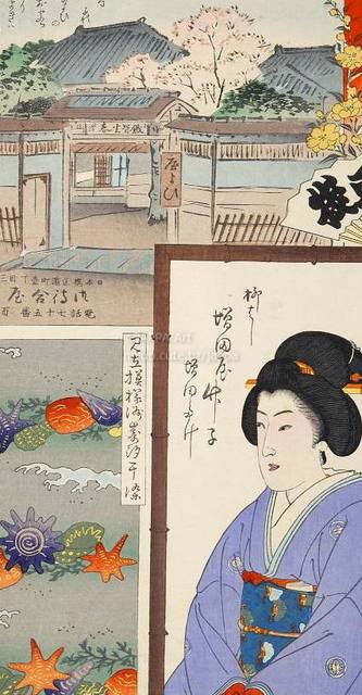 > 豊原国周, 梅素薫 - 東京自慢名物会:竹本京枝:ヒラ辰:御待合 屋よひ:柳はし 増田屋竹子 増田たけ:見立模様洲嵜汐干染