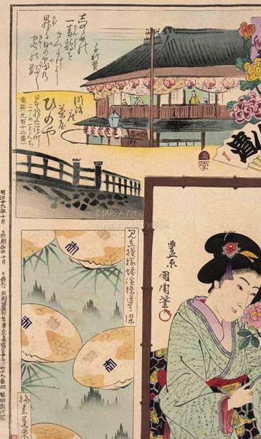 > 豊原国周, 梅素薫 - 東京自慢名物会:竹本小清:ビラ辰:明治座茶屋 ひのや:柳ばし ひのや光子 前田光:見立模様蠣濱橋道了染