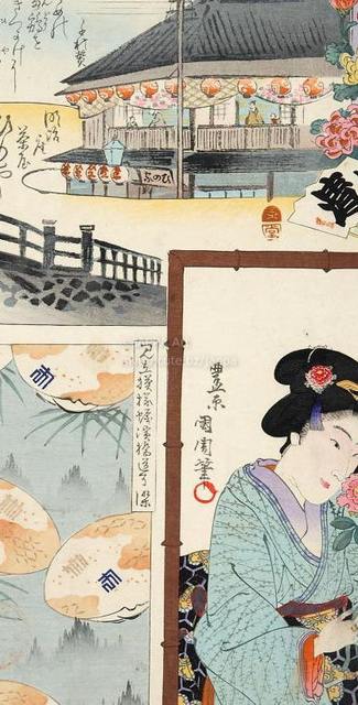 > 豊原国周, 梅素薫 - 東京自慢名物会:竹本小清:ビラ辰:明治座茶屋 ひのや:柳ばし ひのや光子 前田光:見立模様蠣濱橋道了染