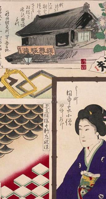 > 豊原国周, 梅素薫 - 東京自慢名物会:竹本朝太夫:ビラ辰:額縁製造 鷲塚鉄藏:よし町 田中家小僧 田中たけ:見立模様十軒店祝染