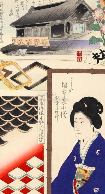 > 豊原国周, 梅素薫 - 東京自慢名物会:竹本朝太夫:ビラ辰:額縁製造 鷲塚鉄藏:よし町 田中家小僧 田中たけ:見立模様十軒店祝染