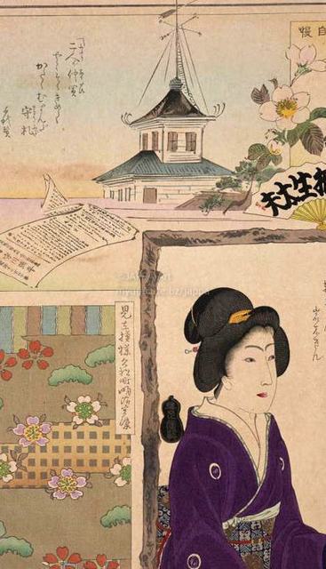 > 梅素薫 - 東京自慢名物会:竹本相生太夫:ビラ辰:守川彌平:よし町三輪家きんし 岩本きん:見立模様久松町明治座染
