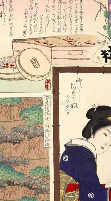 梅素薫 - 東京自慢名物会:竹本組太夫:ビラ辰:魚がし弁松亭 樋口貞次郎:柳ばし ひのや奴 山口ふぢ:見立模様根岸御行の松染