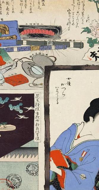 > 梅素薫 - 東京自慢名物会:竹本識太夫:ビラ辰:美術品発賣元 玉寶堂 飯塚伊兵衛、長岡商店:女優 かつら 加藤てる子:見立模様木挽町歌舞伎座染