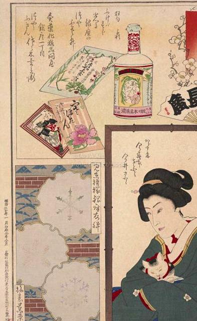 > 豊原国周, 梅素薫 - 東京自慢名物会:竹本長廣:ビラ辰:賣薬化粧品問屋 つやふきん佐々木玄兵衛:からす森 今春本さと 今井さと:見立模様銀座友禅