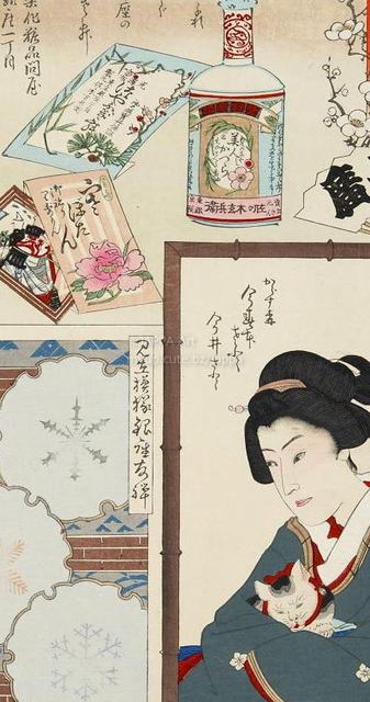 > 豊原国周, 梅素薫 - 東京自慢名物会:竹本長廣:ビラ辰:賣薬化粧品問屋 つやふきん佐々木玄兵衛:からす森 今春本さと 今井さと:見立模様銀座友禅