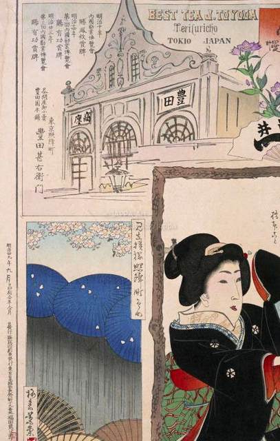 > 梅素薫 - 東京自慢名物会:邑井一:茶問屋卸小賣豊田園本鋪 豊田甚右衛門:柳はし いせき千吉 橋本こと:見立模様照降町そめ