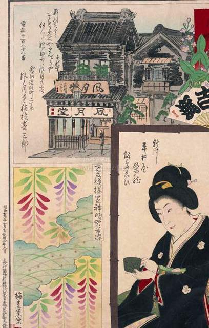 豊原国周, 梅素薫 - 東京自慢名物会:邑井吉瓶:ビラ辰:風月堂 穂積峯三郎(支店)菓子:新はし 平井屋栄龍 飯島ゑひ:見立模様芝神明祭器染